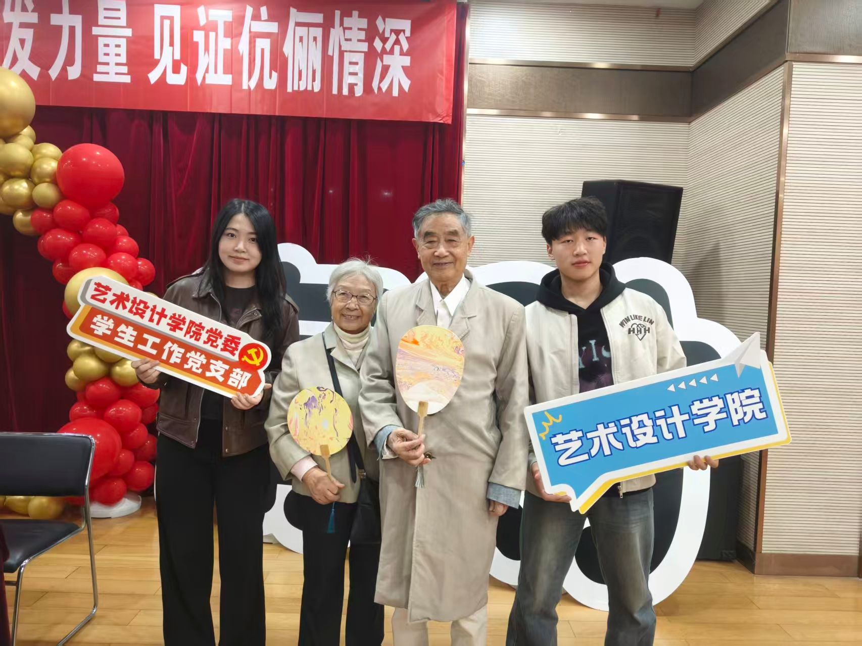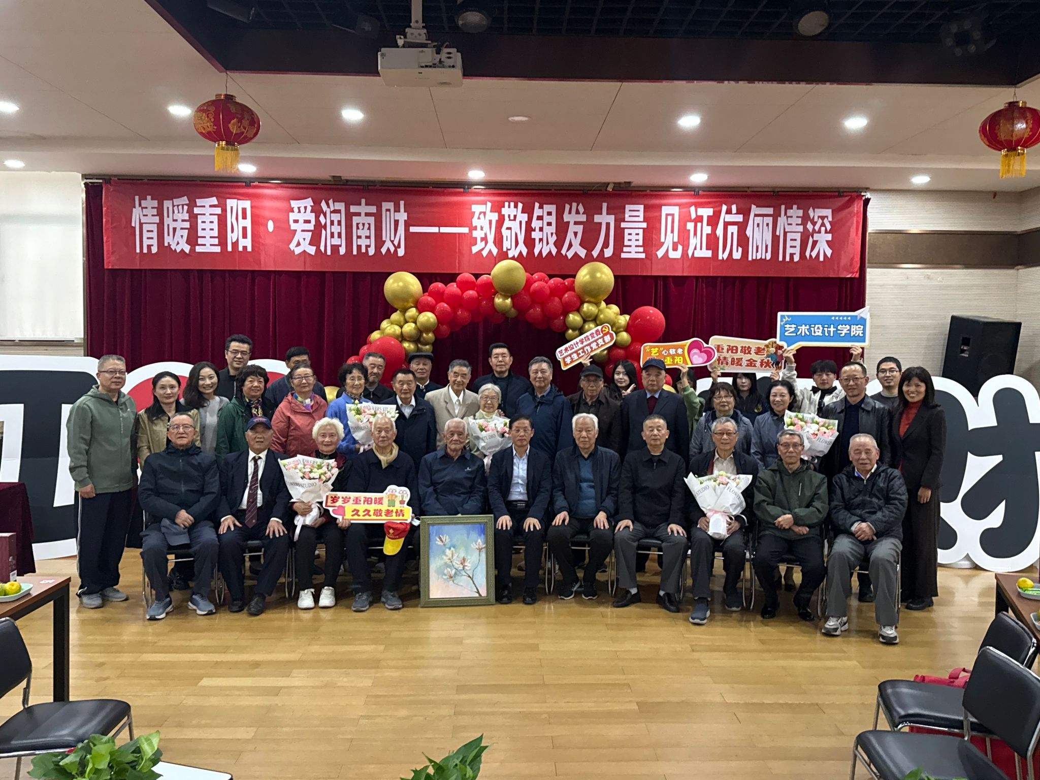 在我校离退休党委、离退休工作处主办的“情暖重阳·爱润南财——致敬银发力量 见证伉俪情深”重阳节集体祝寿活动现场,学生党员代表为离退休老教授俞寿颐献上了我院学生绘制的玉兰花画作。俞寿颐老教授是101岁抗美援朝老战士,“花中君子”不仅是对他高尚品德、一生修养的赞美,更表达了艺设学子对他健康长寿、生活美好的祝愿。