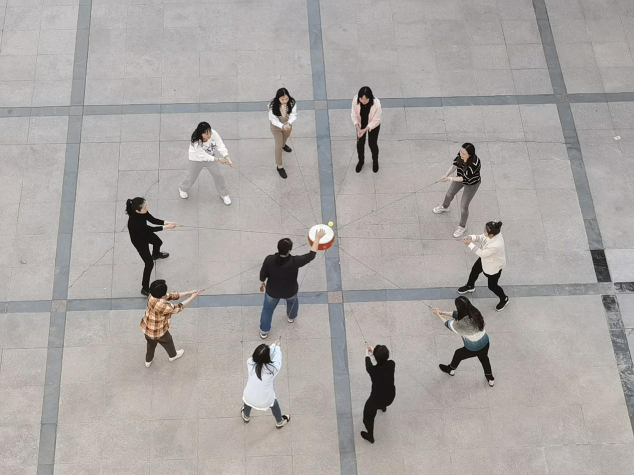 同心鼓比赛要求每支队伍的成员通过牵引系在鼓上的绳索,协同颠动鼓面上的排球,并尽可能实现连续击球。这项活动不仅考验个人的反应与技巧,更注重团队的默契配合与节奏统一,是对团队协作能力的生动检验。